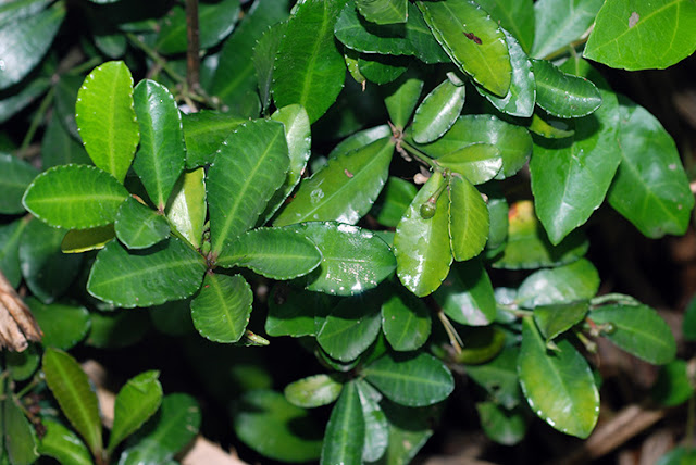| 葉革質,倒卵形,鋸齒狀齒緣或銳齒緣,兩面光滑;葉柄光滑。 |