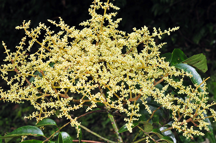 山豬肉。喬木。奇數羽狀複葉,幼時呈豬肝色,羽軸豬肝色或略淡;成熟小葉革質,長橢圓披針形,長3 -15c m ,寬2 -3.5c m ,漸尖至尾狀漸尖,通常刺狀鋸齒緣,稀全緣。花序初具繡色毛,漸變無毛。花排成分枝的圓錐花序;苞片早落;花瓣5;內外排列-外層3,較大;內層2,較小,捲曲狀;雄蕊5枚-2枚可孕(與內層花瓣對生)。盛花期在6-7月間。