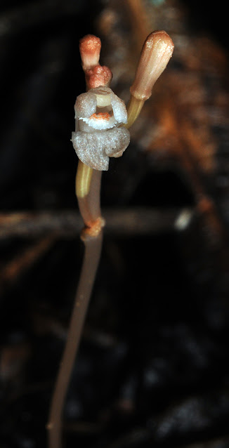 在蘭嶼遇見兩種腐生蘭:吊鐘鬼蘭(鬼蘭)與小鬼蘭。吊鐘鬼蘭因已錯過花期,只拍到植株與蒴果;小鬼蘭則是花果具全。小鬼蘭唇瓣較窄且末端具細齒緣可做為區隔依據。
