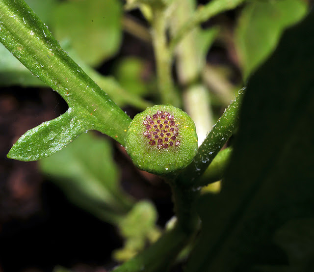 | 頭花中間(紅褐色者)為兩性花;邊花為雌花。均可稔。(左邊-花苞)。 |