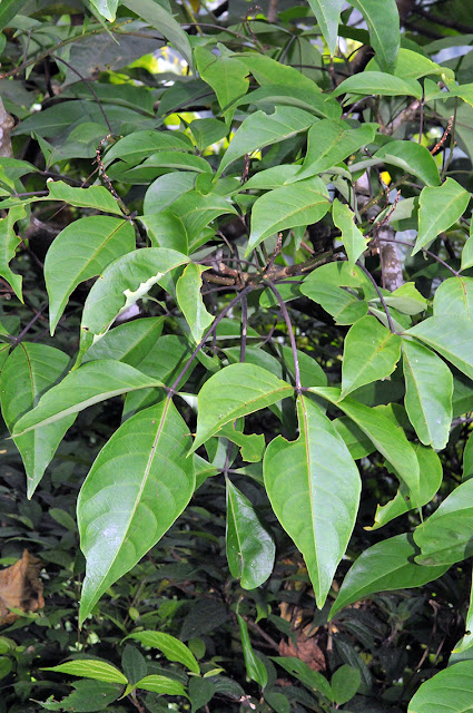 掌狀複葉,互生,具長柄。小葉3,頂小葉長倒卵形,全緣,先端銳尖,下表面灰白,側脈4-7對,網脈不明顯,小葉柄短。側小葉基部歪斜。 |
