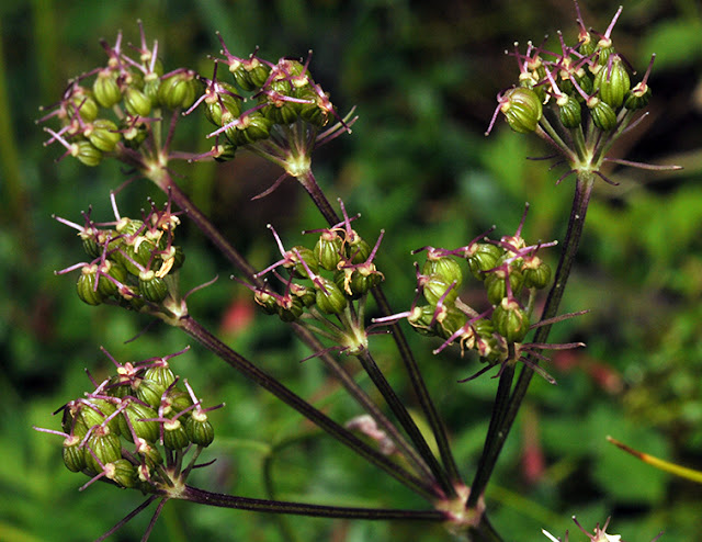 找了好久都沒找到,原來她的盛花期在8月中旬。植株形態像玉山茴香,找尋唯有從花序著手-本種花序較玉山茴香繁複,小花序花朵數多,花瓣白,邊緣帶淡紫,柱頭如蝸牛上兩角-微彎。
