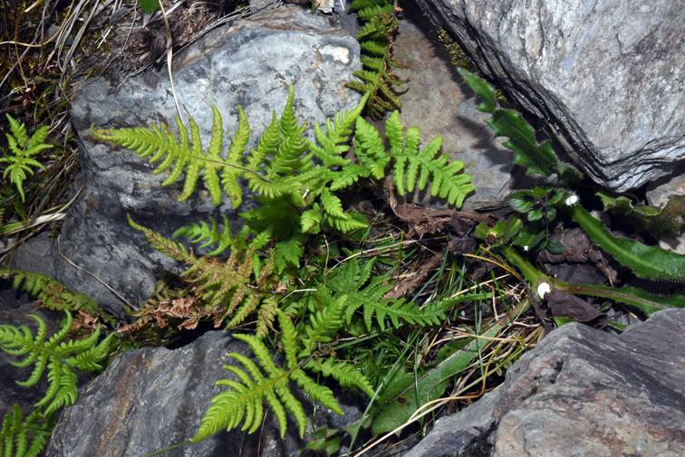 | 長柄卵果蕨-高海拔地區地生蕨。喜生潮濕小溪澗旁之岩縫間或箭竹林下。(攝於合歡山)。 |